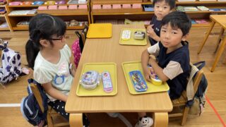 ようちえん日記 2025.10.6 おべんとう風景 今日はおべんとうの日。クラスごとにいただきます。今日はテーブルごとにおいのりする日みたい。テーブルみんなが支度を終わるまで待ってくれているの優しいね。揃ったらおいのり。青グループが先導しておいのりを始めます。さあ、おいしくいただきましょう♪... 2025.10.06 ようちえん日記