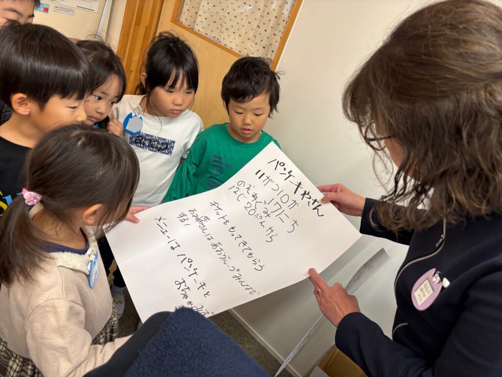 2025.11.5 青グループの計画 ようちえん日記 2025.11.05 昨日今日と青グループが職員室の園長先生を尋ねてきます。何を相談しているの? パンケーキやさんをやりたいそうです。だから企画書を持ってきたのね。 日時や必要な物の相談。幼稚園に無い物は買わなくてはなりません。お金が要りますね。「パンケーキやさんやってみましょう!」園長先生よりゴーサインが出ました😊 さあ、開店に向けて準備しなくっちゃ✨