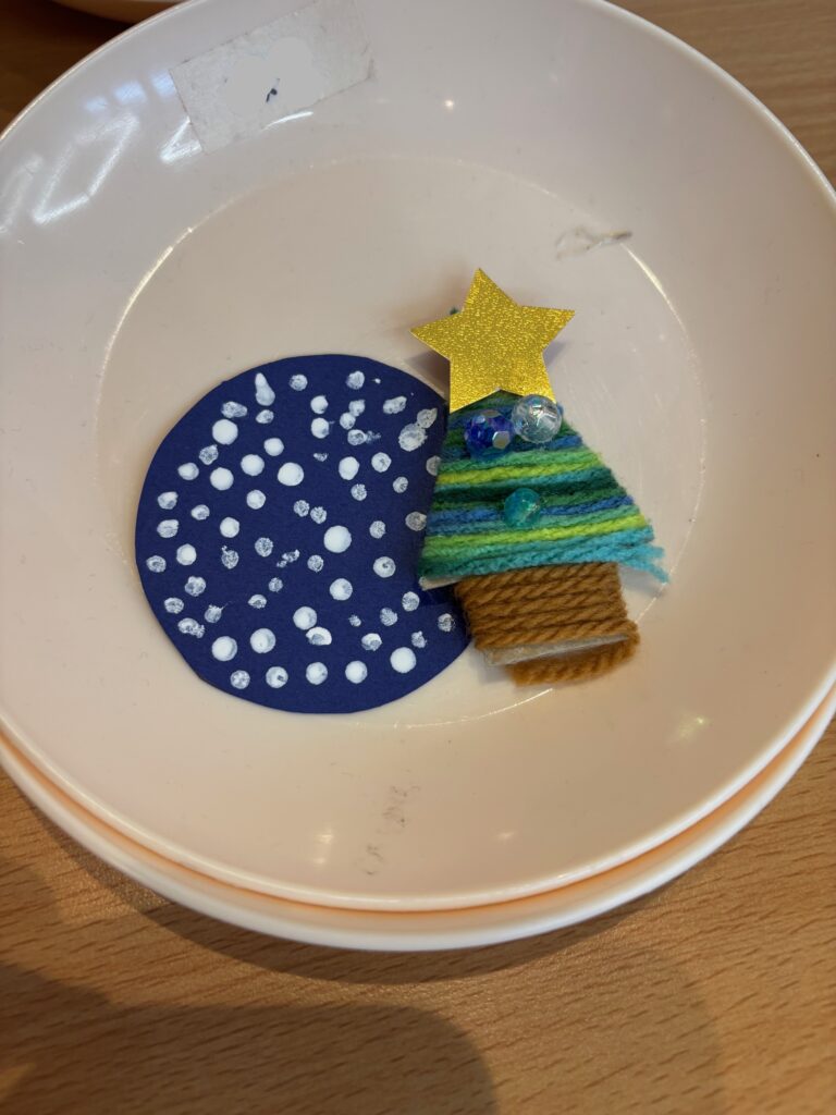 青グループが手作りのオーナメントを