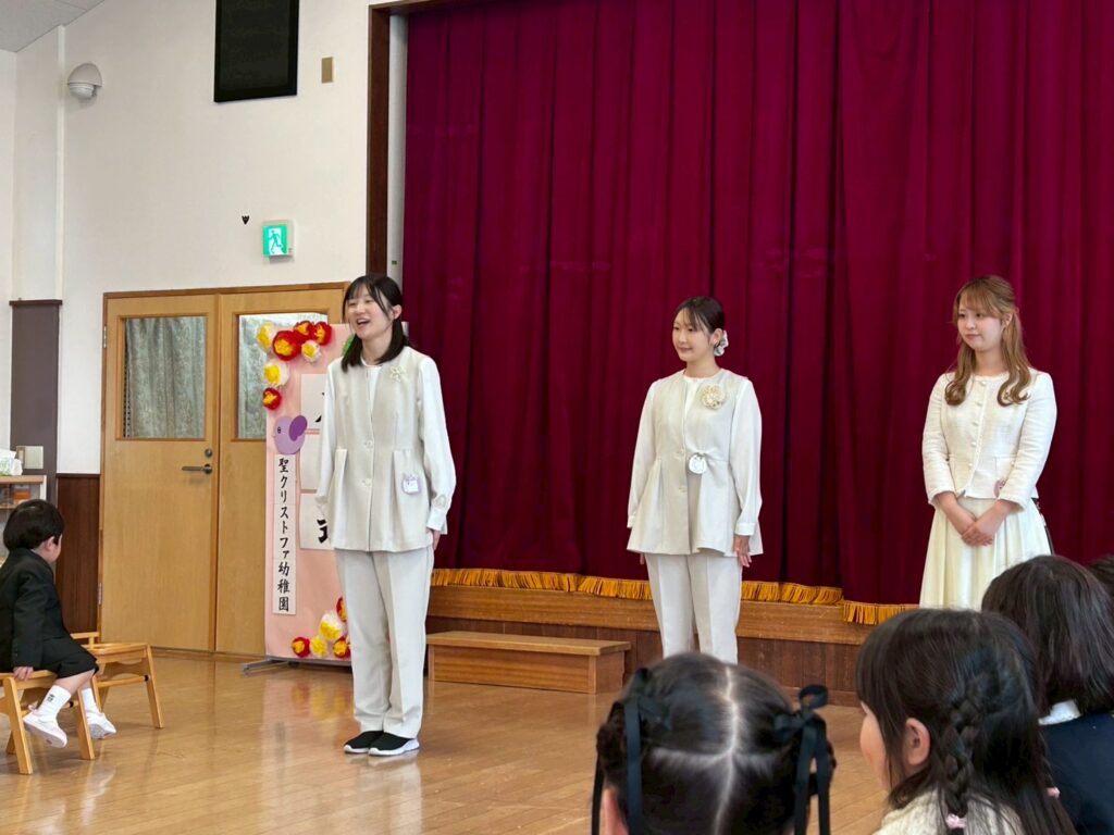 2026.4.10 入園式 ようちえん日記 2026.04.13 先週の金曜日は入園式でした🌸 子どもたち、おうちの方が集まり幼稚園の先生たちとみんなで晴れの日を祝いました✨ 担任の先生たちからごあいさつ。なんと二人の先生の服がお揃い笑これまた面白くておめでたかったです。 「はらぺこあおむし♪」ちょうちょみたいにみんなが羽ばたけますように🦋 クラスでは一人ひとり名前を呼ばれたら返事をして お祝いのプレゼントをもらいました。 こちらのクラスではタンバリンジャンプ! 園長先生だってジャンプします笑 これから一年間楽しく過ごしましょうね😊