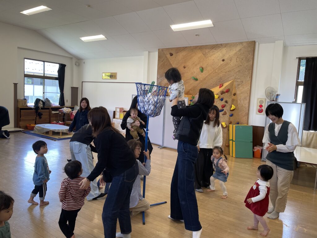 最初にママが、子どもを抱っこして、子どもが玉を入れる「玉入れ」