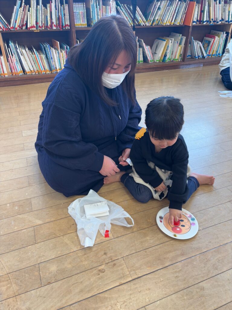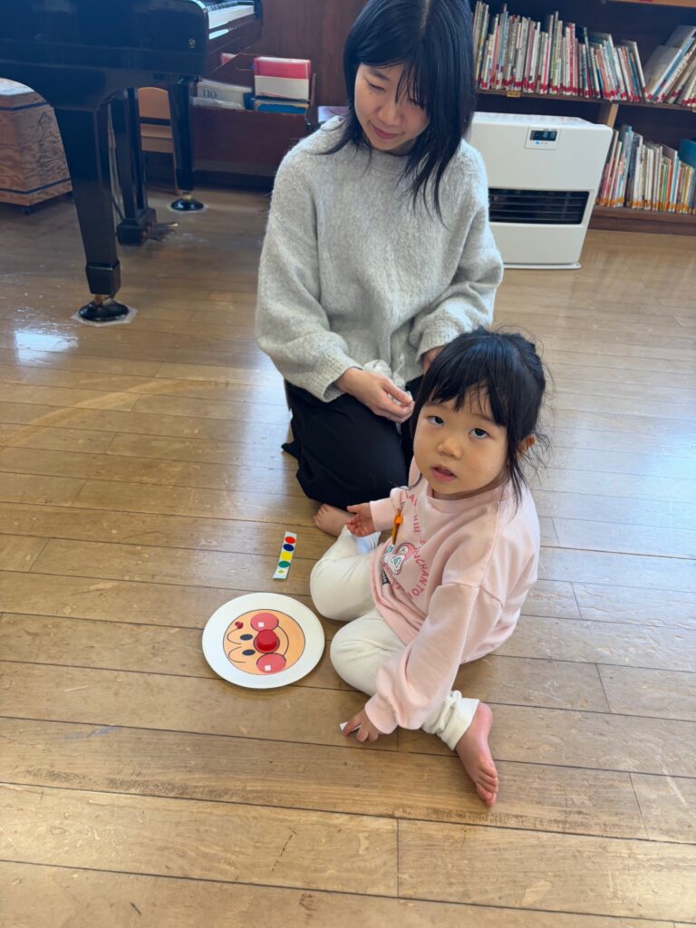 2026.1.15 おひさまひろば おひさま日記 2026.01.15 2026年初めてのおひさまひろば今日もたくさんのお友だちが来てくれました。好きな遊びを楽しんだり。おうちの方同士やスタッフの先生とおしゃべりしたり。 今日は「いとまきのうた」をご紹介。実はみんなが知らないメロディが存在していました!今度はうんどうあそび♪ 歩いたり、はいはいしたり。ピアノに合わせて止まったり! 制作ではアンパンマンのこまを作りました。 よーく回ったね😊 次回は1月29日です。待ってまーす✨
