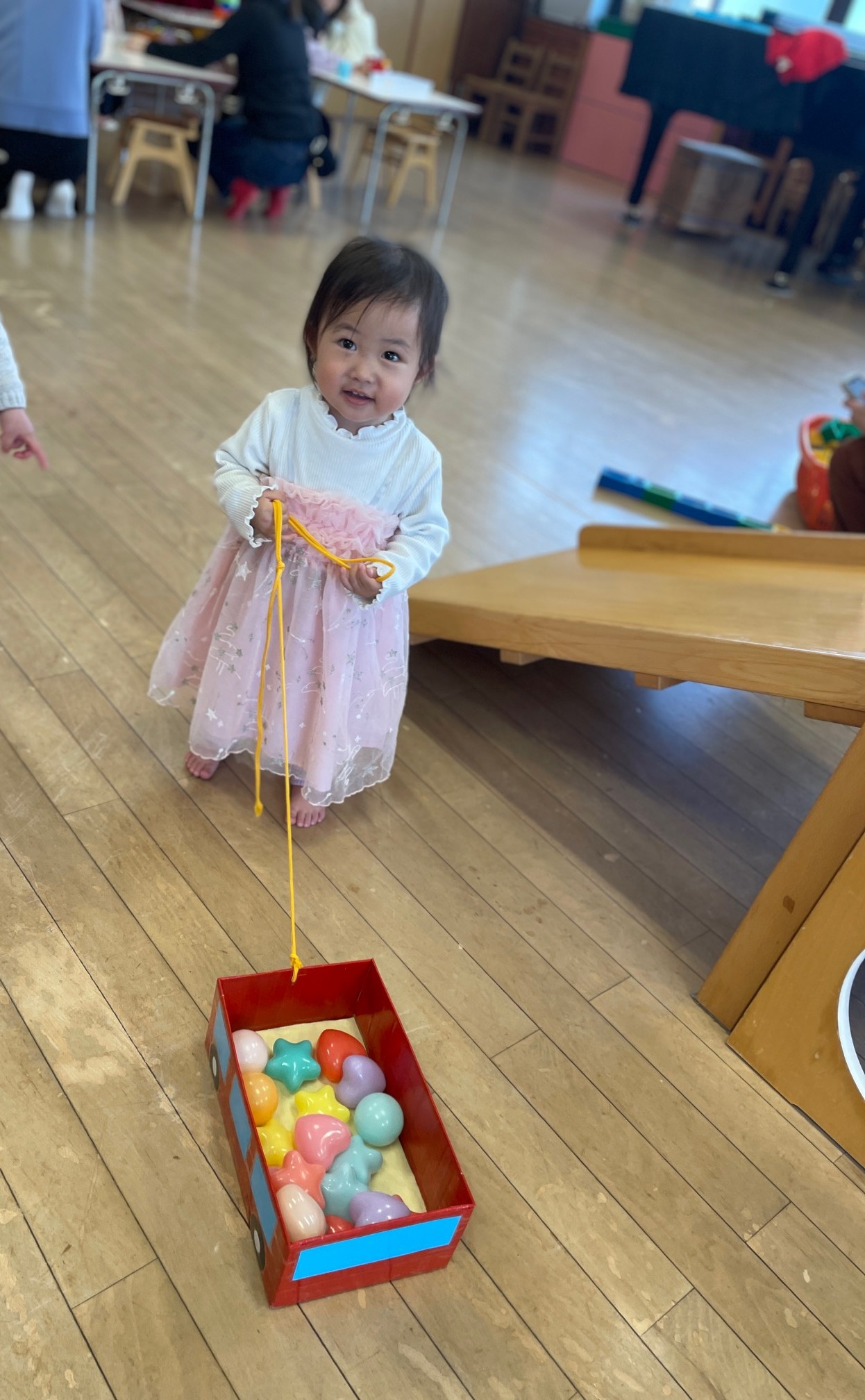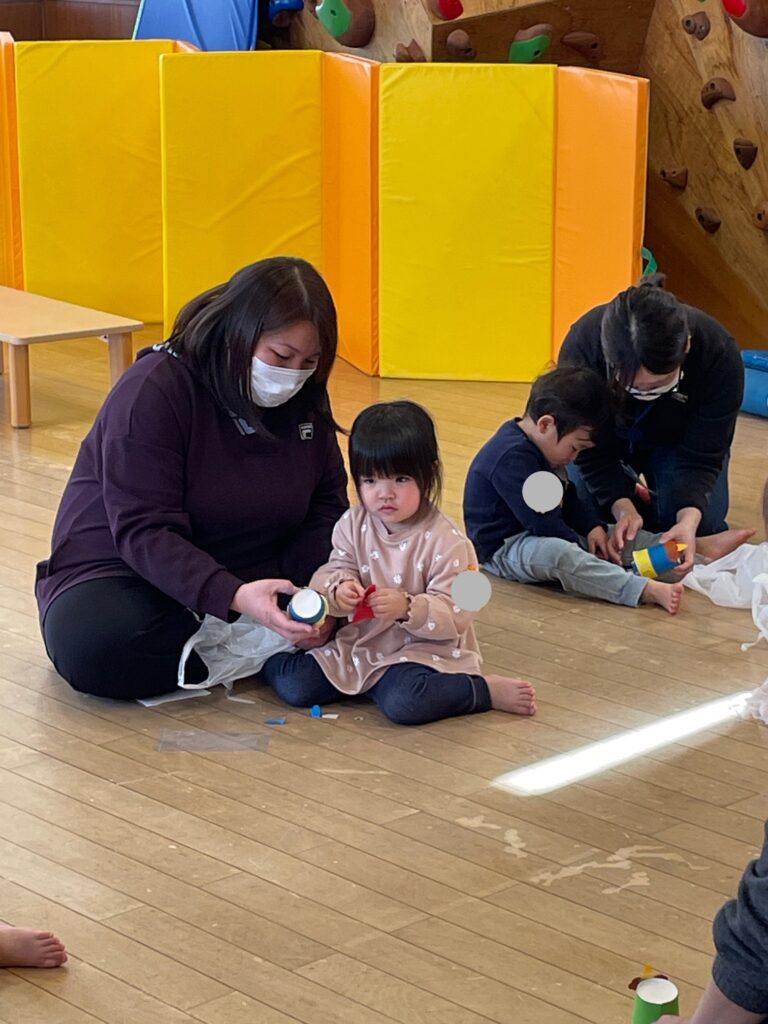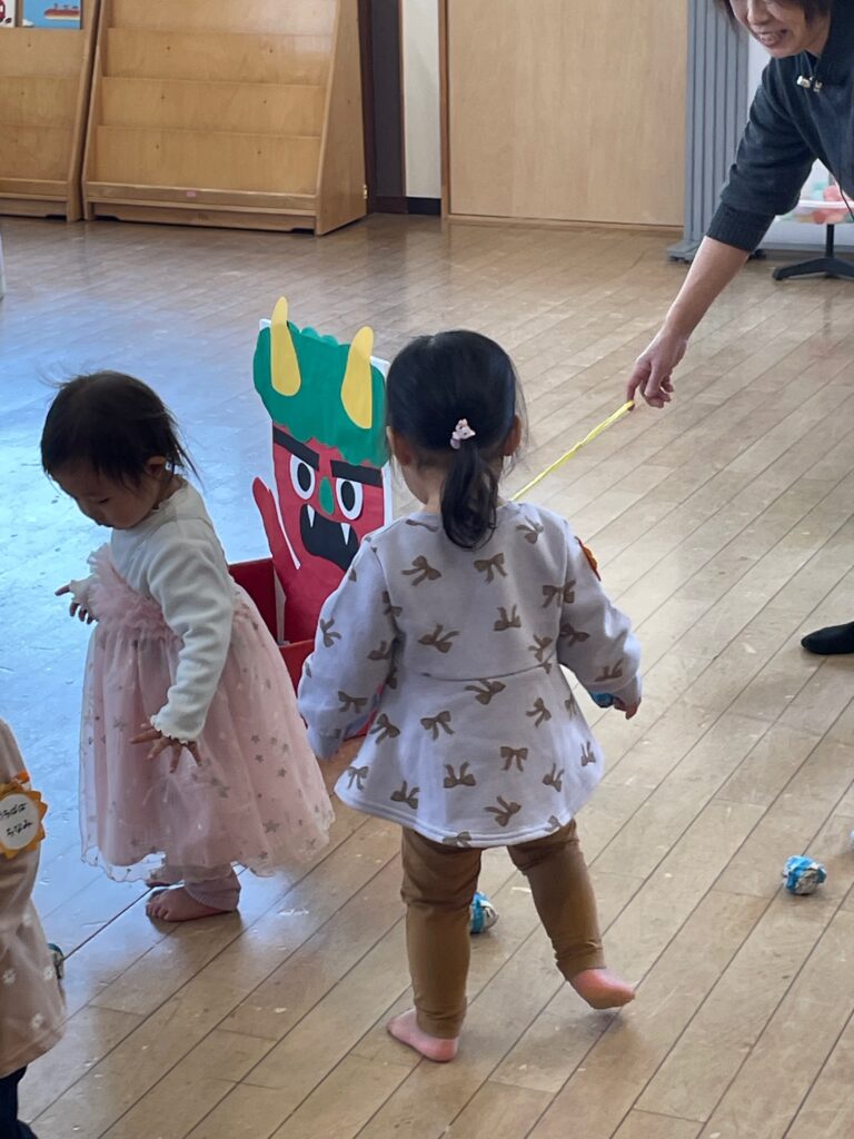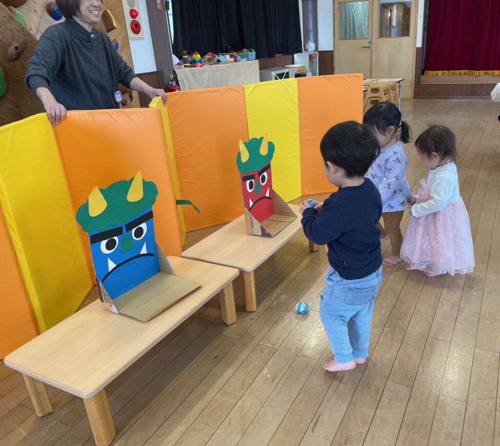 2026.1.29 おひさまひろば おひさま日記 2026.01.29 今日のおひさまひろばもまずは好きな遊びから😊 さて、その後は季節のあそび今日は「まめまき」です👹 「おにはそとー!」 新聞紙の豆で倒したと思ったら今度は大きな鬼👹「待てー!」 鬼も無事に退散したところで鬼のおもちゃを作りましょう。 コロコロ転がる「コロコロおに」 最後は鬼の絵本を読んでおしまい。 次回のおひさまひろばは2月12日(木)です。来てねー♪